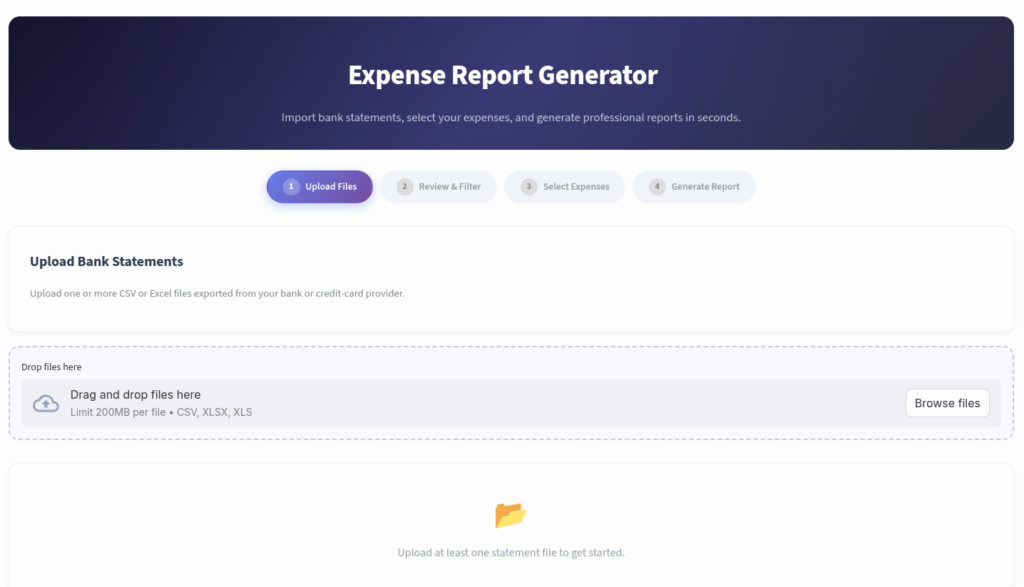 Online tool to generate expense reports easily in Excel and PDF format. To use, simply upload your credit card, bank or other financial statements and the application will extract all the expenses from your documents and allow you to choose which transactions to add to your final expense report.