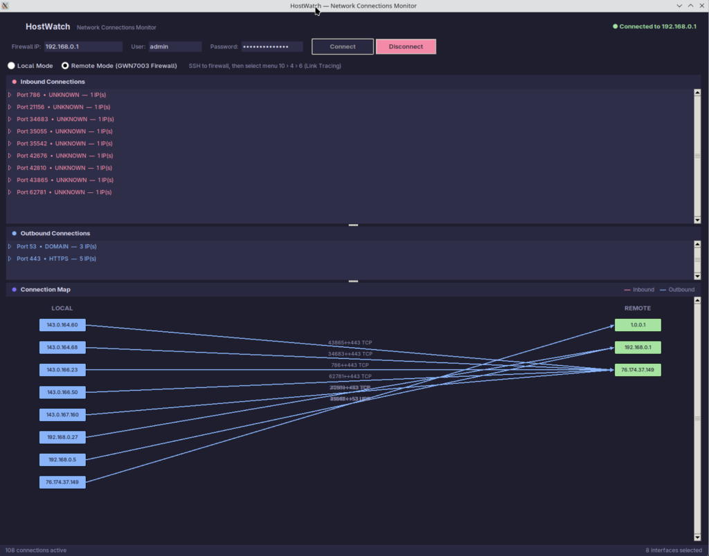 Hostwatch is a utility that allows you to visually see what traffic is moving between your PC, Network and Internet. It also allows you to graphically monitor connections between your Grandstream Router/Firewall (7xxx Series) in real time. The utility can be switched between your local PC or Grandstream firewall.