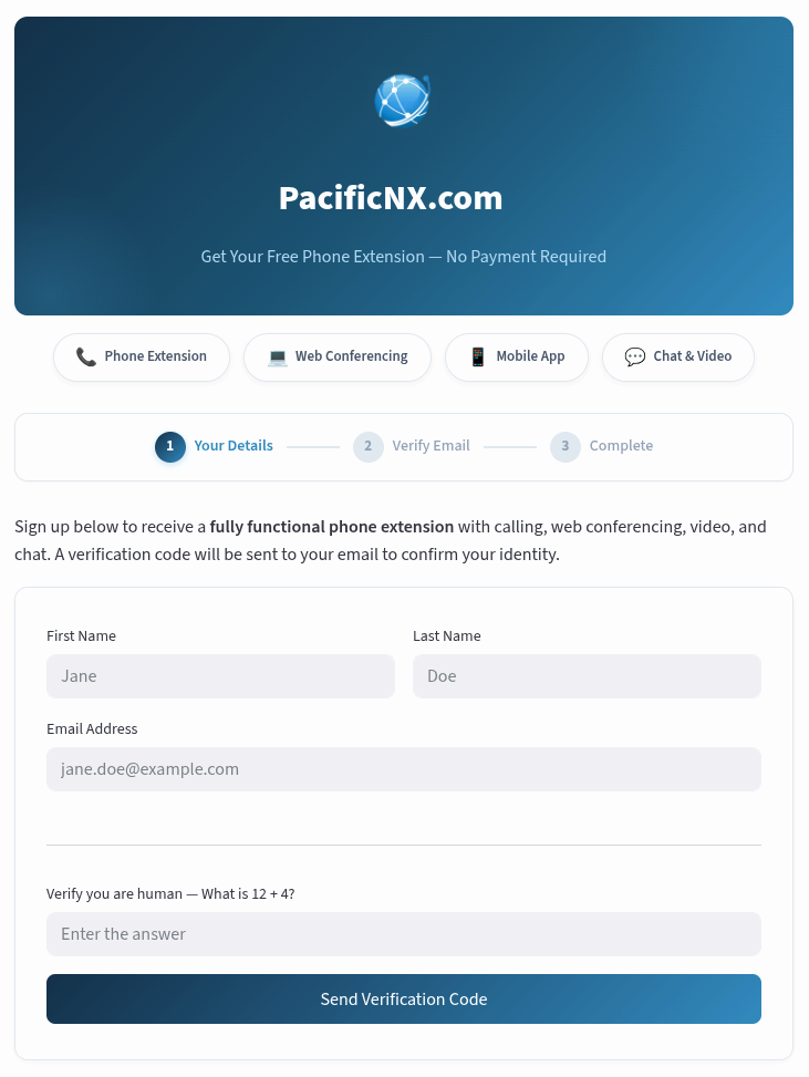 PacificNX.com is a service that offers a 30 day unlimited trial that provides a fully functional soft phone, extension, web conferencing, video calling and chat for your business needs. No credit card required.